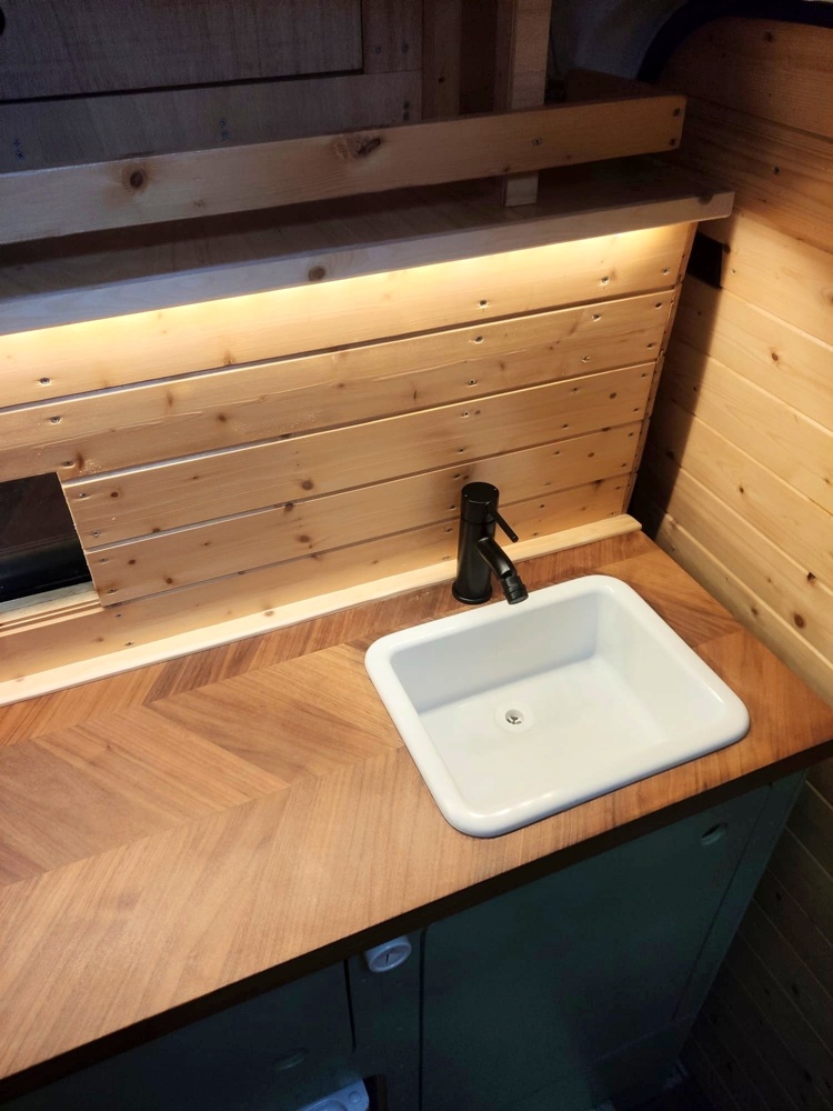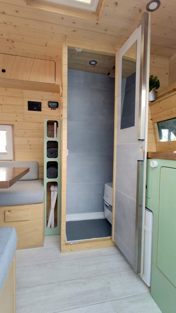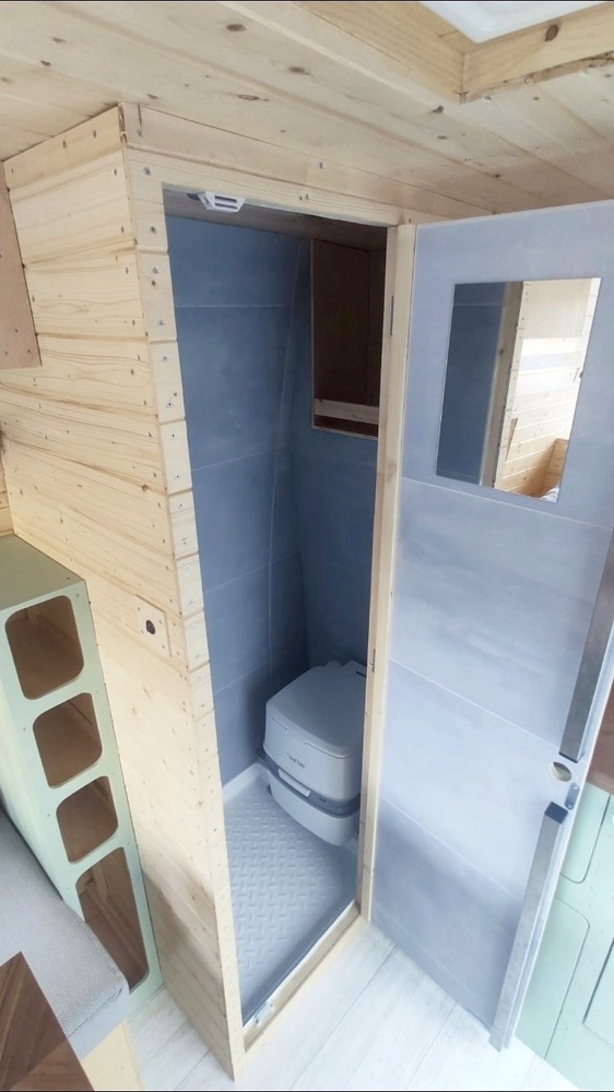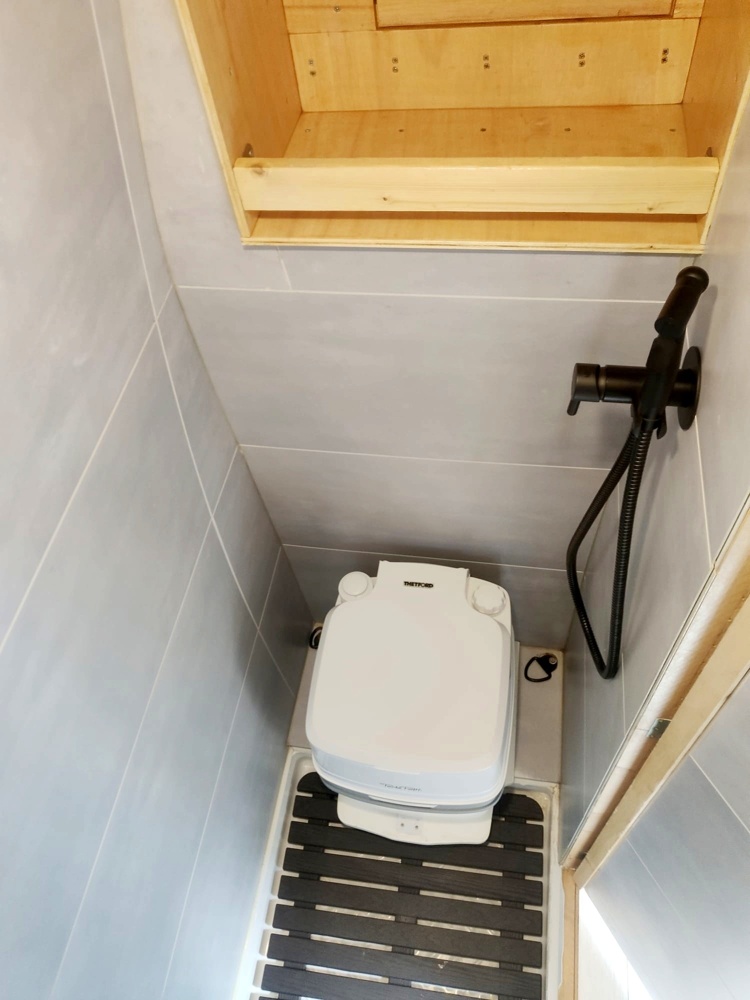 The WC is equipped with a chemical portable toilet and it’s prepared for having an inside shower from 1 of the 2 portable showers provided (electrical or foot pump system).