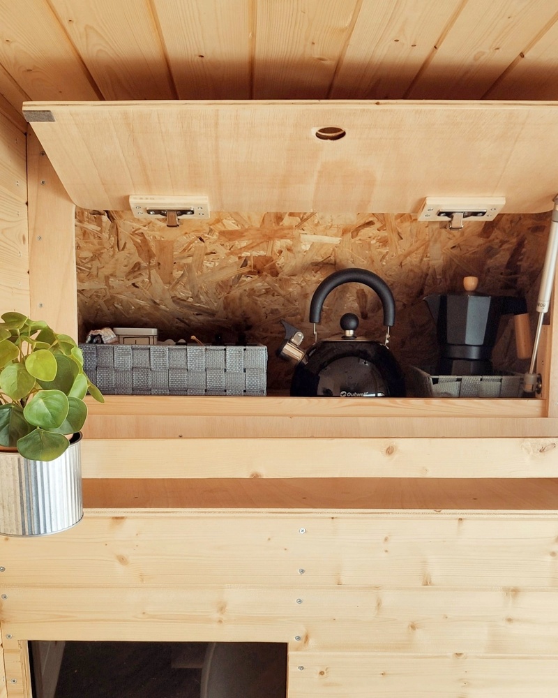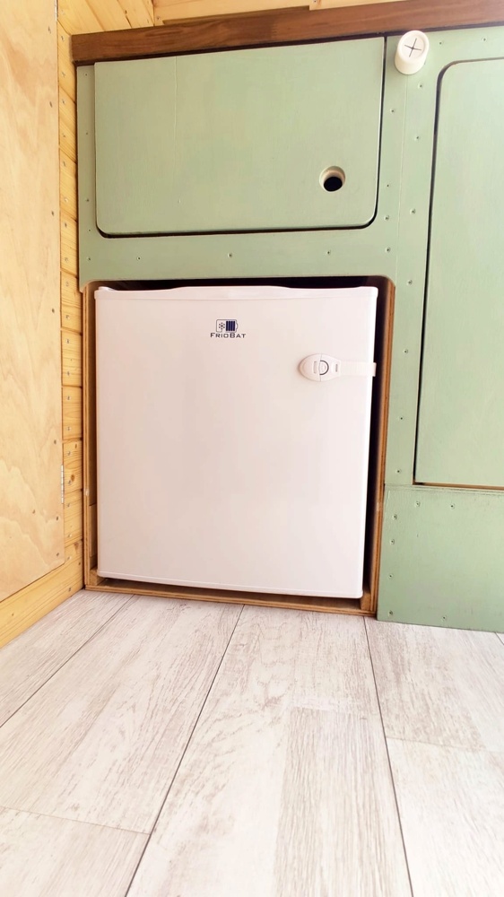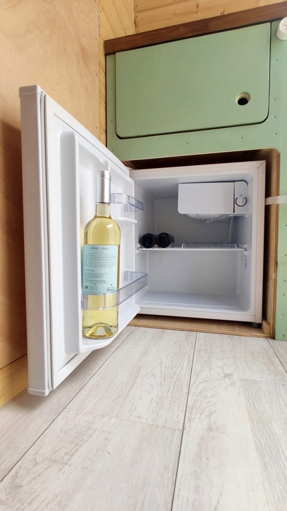 Its wood interiors and two layers of insulation helps it stays fresh in summer and warm during winter. It has a standard size double bed (195cm x 140 cm) with a super comfortable made in Portugal mattress. Underneath it, it has plenty of room for the rentals luggage and also for the outdoor table and chairs provided.